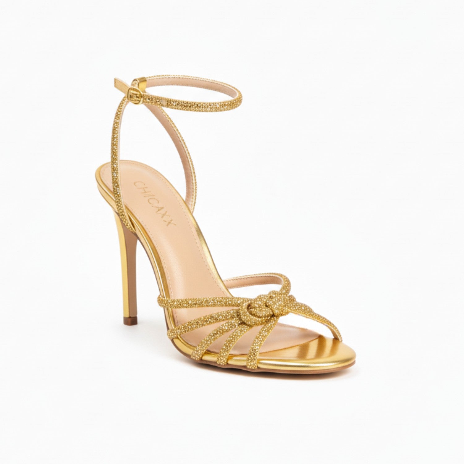 Crystal Knot Featuring shimmering Gold wrap-around straps and a signature knot detail. Perfect for weddings, festive nights, or statement style moments.