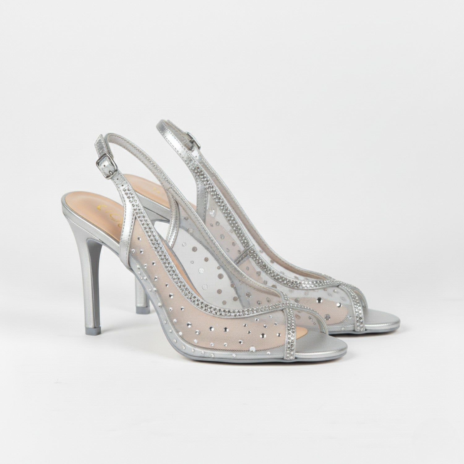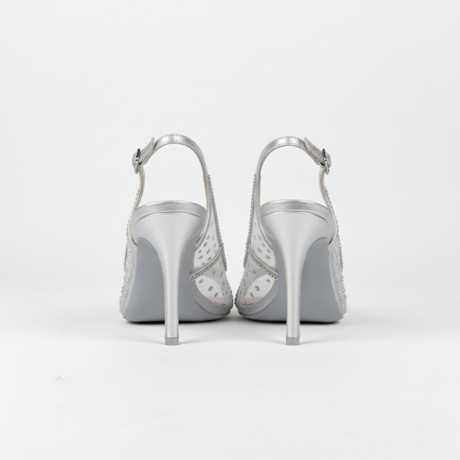 Radiant silver stilettos with mesh rhinestone detailing and open toes—crafted for standout elegance.